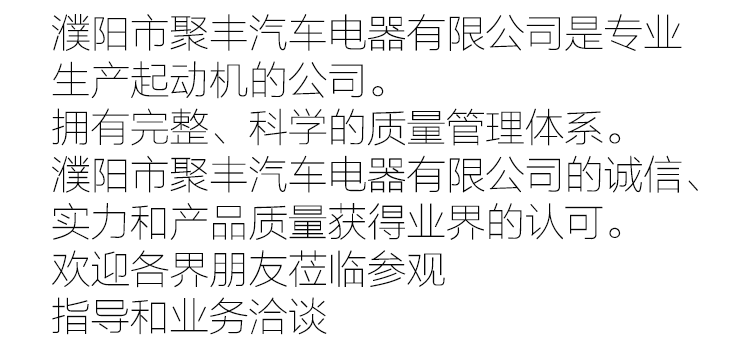 汽車(chē)起動(dòng)機(jī)-減速起動(dòng)機(jī)-起動(dòng)機(jī)生產(chǎn)廠家-濮陽(yáng)市聚豐汽車(chē)電器有限公司 版權(quán)所有 Copyright 2019 All Rights Reserved